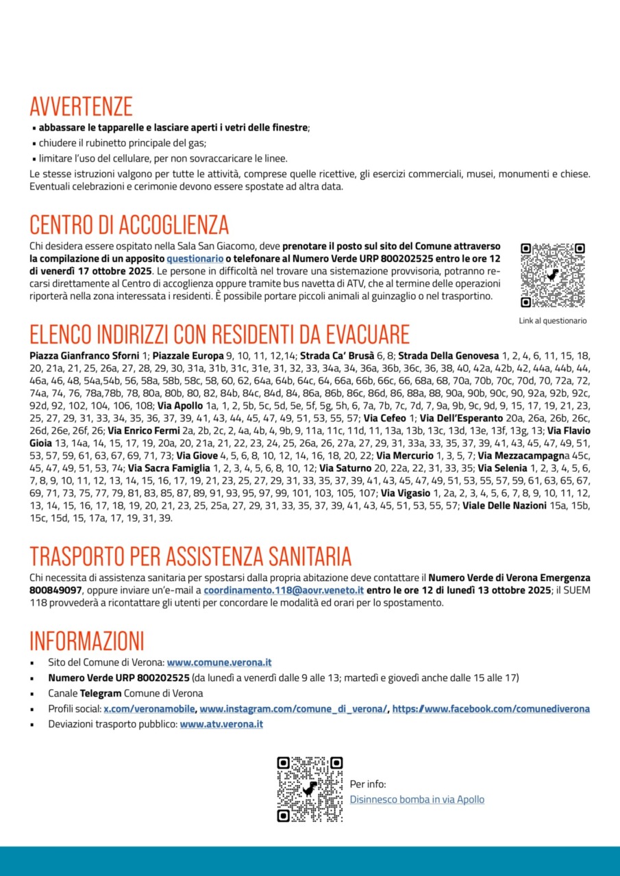 Domenica 19 ottobre 2025, la cittadinanza residente nella zona di via Apollo, nel quadrante Sud del Comune di Verona, dovrà lasciare le proprie abitazioni entro le 7.30 del mattino. L’area sarà interessata dalle operazioni di disinnesco e rimozione di una bomba della Seconda Guerra mondiale, rinvenuta nei giorni scorsi.