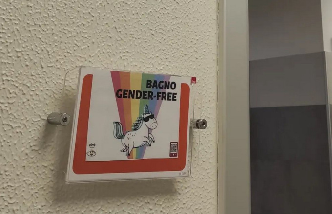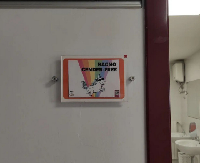 “Dopo aver organizzato dal 13 al 17 maggio una serie di eventi a sfondo omosessualistà in Università di Verona ( finanziati dall’Ateneo, ergo dalle tasse di tutti gli studenti), non pare essere finita in ambito accademico per quanto concerne la propaganda LGBT. Il 31 maggio il collettivo queer ‘Eimi’’ ha tappezzato le insegne dei bagni dei maschi (e non) con degli adesivi con la scritta ‘gender free’. Hanno pubblicato il tutto sul loro profilo Instagram riprendendo anche il profilo dell’Università, senza alcuna reazione. A prescindere dal contenuto, non è consentito dal regolamento apporre adesivi su indicazioni di luoghi di pubblica utilità, anche a scopo ideologico. Chiediamo al Rettore Nocino di intervenire o quantomeno di fornire una spiegazione per questi abusi”.