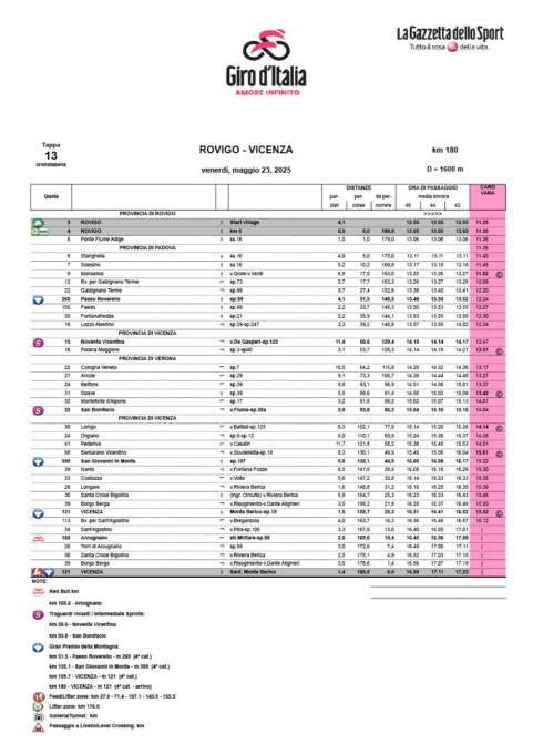 Qui di seguito ecco i dettagli del cronoprogramma, altimetria e planimetria della 13esima tappa del Giro d’Italia.