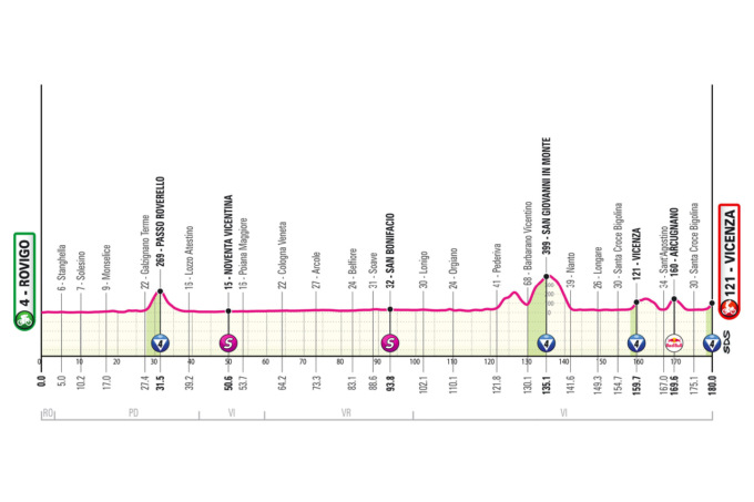 Tappa completamente piatta nella prima parte salvo la breve salita di passo Roverello nei Colli Euganei. A 60 km dall’arrivo si entra nei Monti Berici dove si affrontano continui saliscendi e la salita di San Giovanni in Monte. Dopo un primo passaggio sulla linea di arrivo si percorre un circuito di circa 20 km con la salita di Arcugnano (via Pilla) prima del finale al Santuario di Monte Berico. Si percorrono strade prevalentemente rettilinee con carreggiata di larghezza variabile, intervallate dai centri abitati dove sono presenti i consueti ostacoli al traffico.