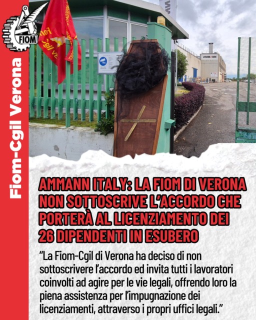 Ma in merito alla vertenza Ammann Italy di Bussolengo non è dello stesso parere la Fiom Cgil di Verona, la quale ha deciso di non sottoscrivere l’accordo, invitando tutti i lavoratori coinvolti ad agire per le vie legali, offrendo loro la piena assistenza per l’impugnazione dei licenziamenti, attraverso i propri uffici legali.