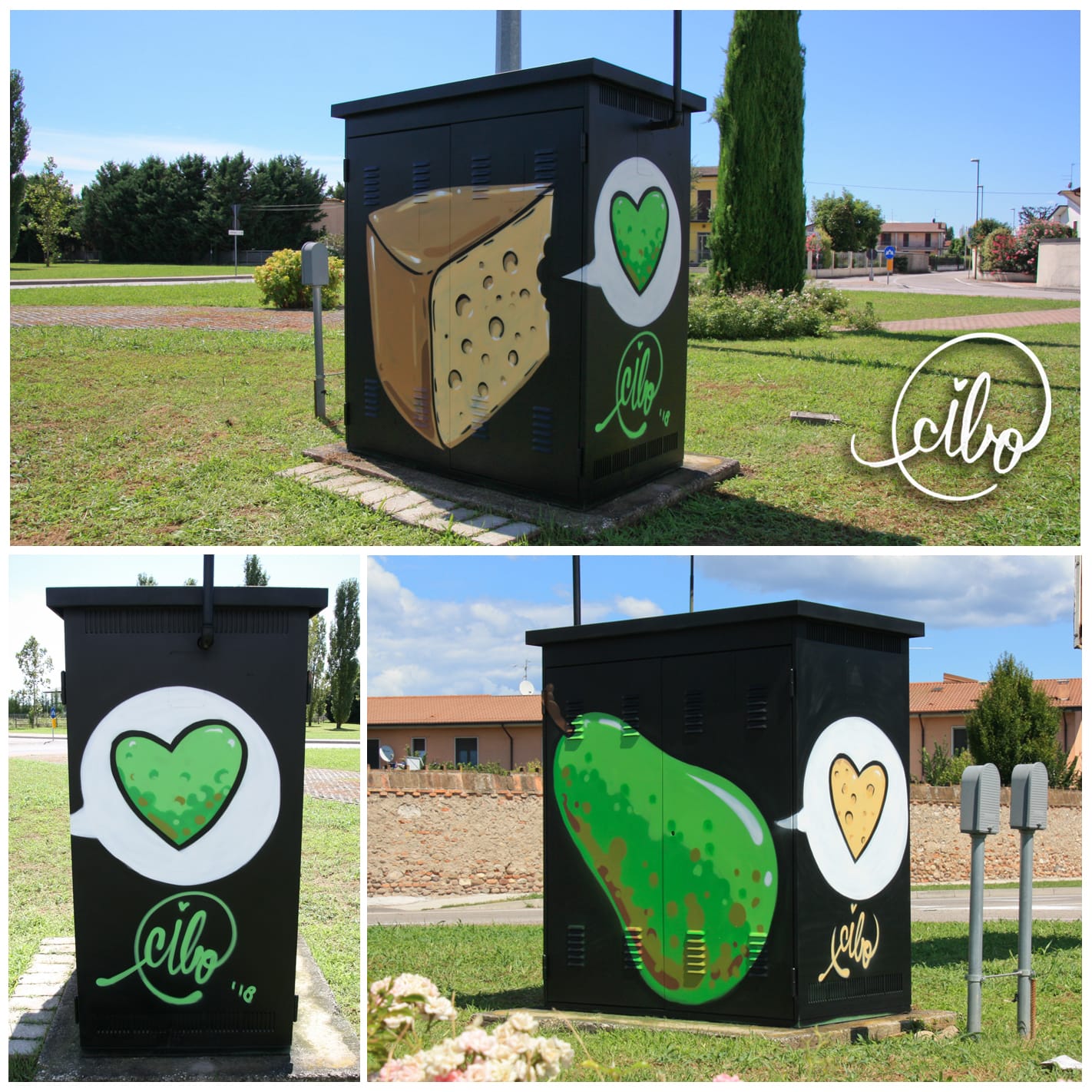 Qualche giorno fa infatti, lo street artist veronese Pierpaolo Spinazzè, ha usato la sua arte per compensare ai graffiti che qualche buontempone aveva lasciato sulle cabine dell’energia elettrica presenti a Zevio. Ecco che delle macchie di spray nero sono diventate formaggio e pere.