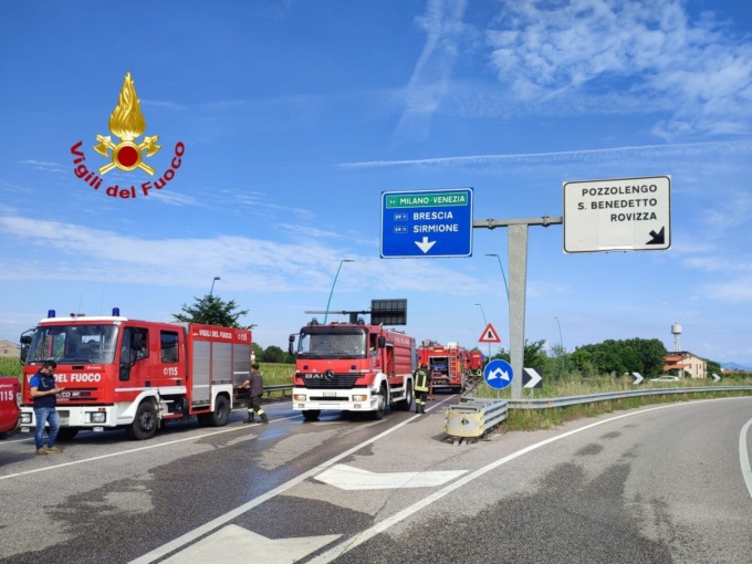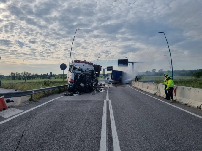 A seguito dell’impatto, uno dei due camion ha poi preso fuoco. Avvertiti i soccorsi, poco dopo sono giunti sul posto i Vigili del fuoco da Bardolino e Verona con tre automezzi e 12 operatori, che hanno spento l’incendio che ha coinvolto uno dei mezzi pesanti e l’auto, nonché estratto uno degli autisti, mentre l’altro è stato sbalzato fuori.