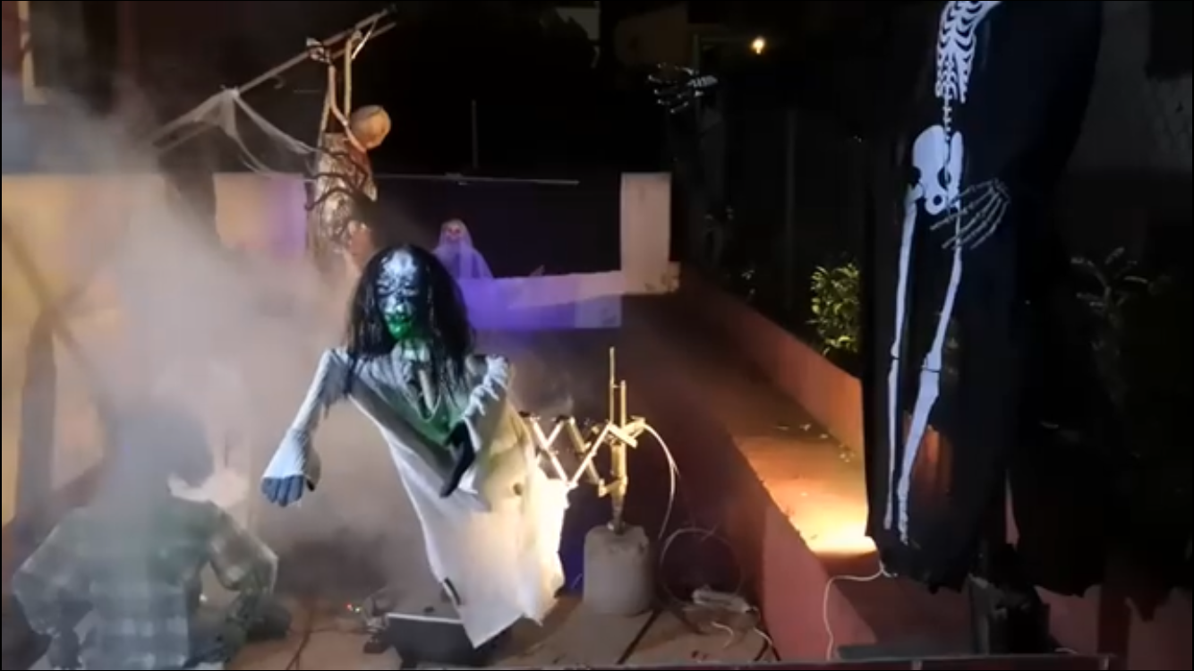 Un fantasma in movimento sopra l’ingresso, l’esorcista che balza in avanti e poi indietro coi capelli al vento un impiccato con un gigantesco ragno a percorrergli il busto, It, la classica strega con annesso pentolone e uno zombie a dare il benvenuto sull’uscio, il re delle zucche e un bidone da cui fa salta fuori un diavolo. Il tutto armonizzato attraverso l’uso di un software.