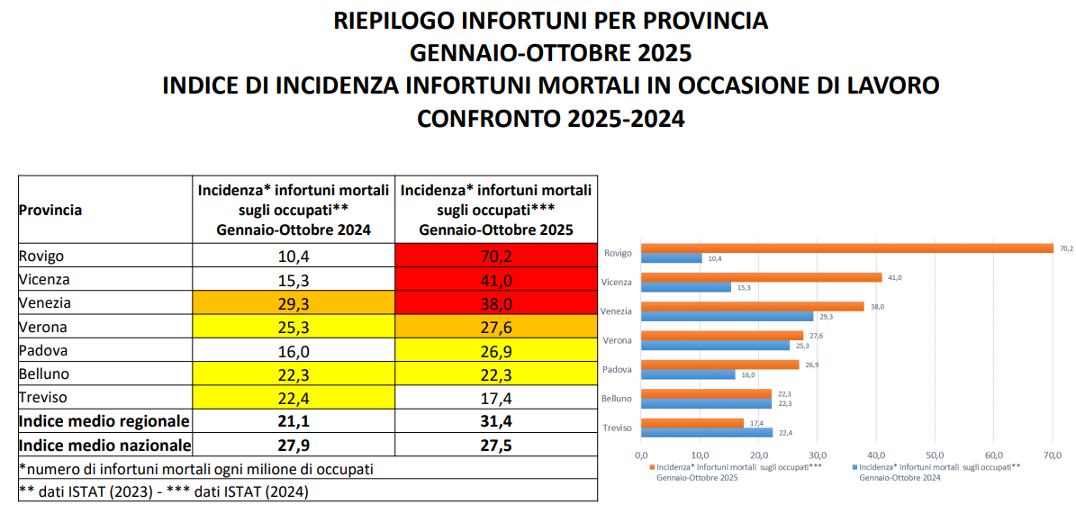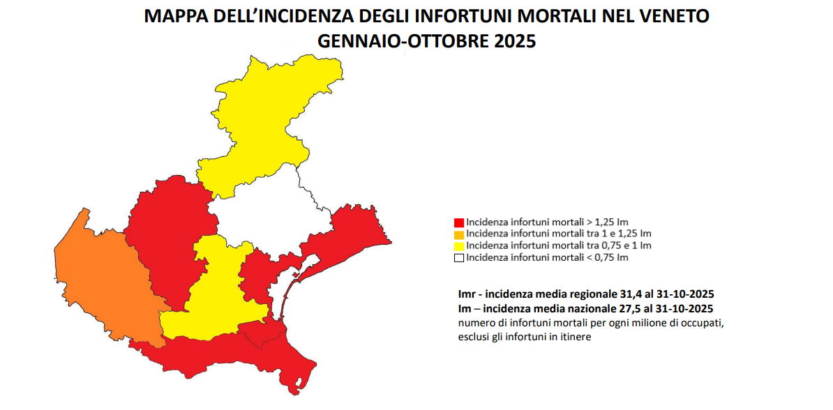 A fine ottobre 2025, il rischio di infortunio mortale in Veneto (31,4 morti per milione di occupati) risulta superiore alla media del Paese, pari a 27,5.