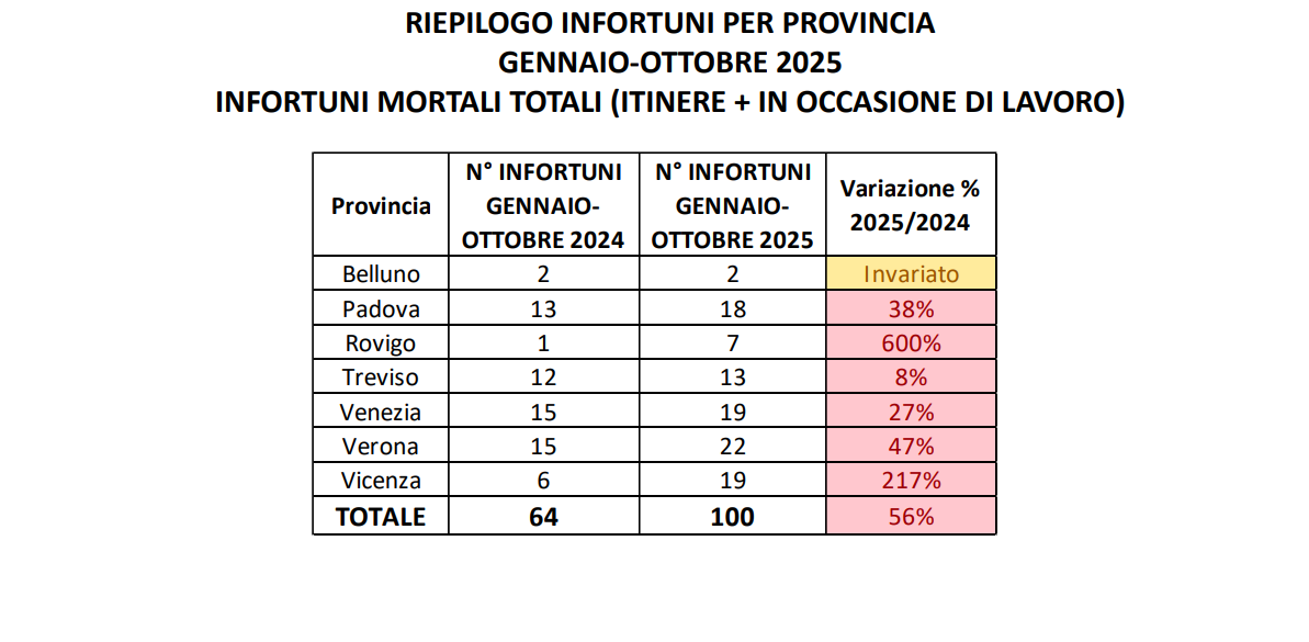 Il nuovo report dell’Osservatorio Vega Sicurezza e Ambiente relativo alle vittime sul lavoro, purtroppo, testimonia un altro dato negativo per il Veneto: tra gennaio e ottobre 2025, infatti, la nostra Regione, in cui ci sono stati 100 morti sui luoghi di lavoro, registra un +56,3% di decessi rispetto allo stesso periodo dell’anno precedente. Queste statistiche fanno restare il Veneto al secondo posto in Italia per numero di morti in ambito lavorativo.