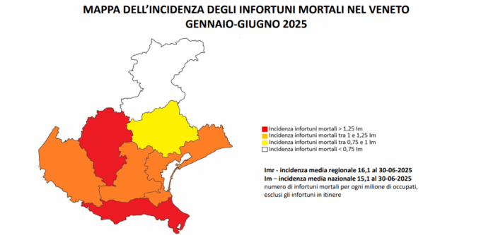 Nella prima metà del 2025, il Veneto continua a essere secondo solo alla Lombardia per numero di decessi totali sul lavoro. Prima è Verona, seguita da Padova, Vicenza, Treviso, Venezia e Rovigo. E con queste proiezioni il Veneto rimane, purtroppo, in zona arancione nella mappatura dell’Osservatorio Vega, con un’incidenza di mortalità al di sopra della media nazionale.