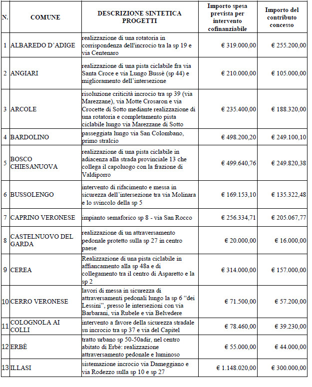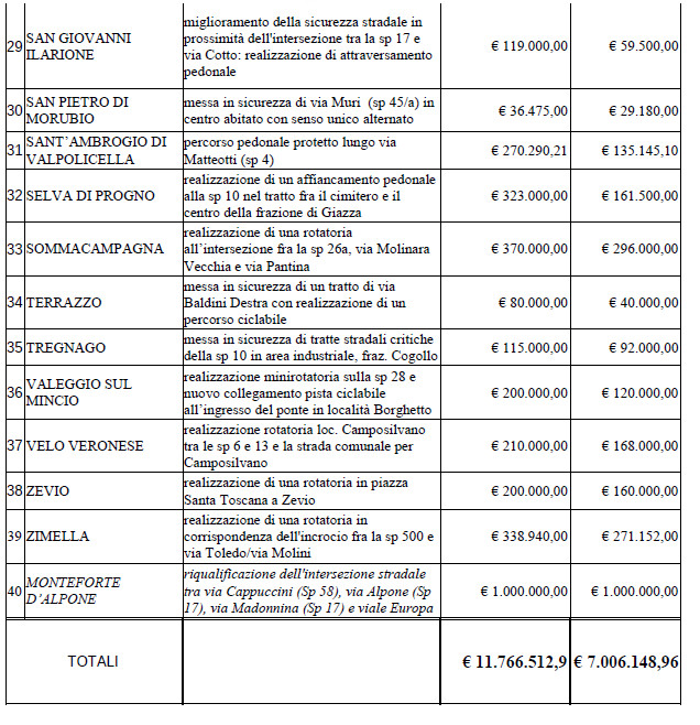 Segue la lista dei 40 interventi, Comune per Comune, con la spesa prevista e il relativo contributo.