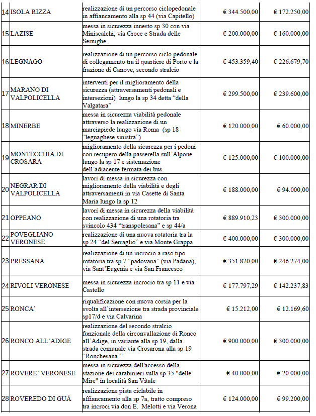 Il cofinanziamento contempla la copertura anche delle spese per i progetti avanzati dai Comuni, che saranno verificati dalla Provincia prima dell’inizio dei lavori. Per le richieste escluse dal contributo, il Presidente si è riservato – qualora le istanze venissero modificate e ritenute ammissibili – di proporre nei prossimi mesi al Consiglio Provinciale il loro accoglimento. I contributi equivalgono a 6 milioni di euro e porteranno a investimenti per circa 10,7 mln. A questi si somma il milione di euro previsto, con un accordo di programma con il Comune di Monteforte d’Alpone, per la riqualificazione dell’intersezione stradale tra via Cappuccini (Sp 58), via Alpone (Sp 17), via Madonnina (Sp 17) e viale Europa nel territorio di Monteforte. Quest’ultima opera è finalizzata a migliorare l’accesso a tutta la Val d’Alpone e sarà pertanto sostenuta dalla Provincia per l’intero importo. “La Provincia c’è e sta lavorando. Ringrazio i colleghi sindaci perché questi interventi dimostrano che la volontà e le competenze da parte delle amministrazioni locali non mancano di certo, ma spesso si scontrano con risorse limitate – ha affermato il Presidente Scalzotto –. Queste convenzioni rappresentano una forma di ‘cooperazione’ che avvicina ulteriormente la Provincia ai Comuni, e dunque ai cittadini. I 40 interventi cofinanziati sono perciò un concreto passo avanti per il miglioramento della sicurezza di pedoni, ciclisti e di tutti gli utenti della strada, pur nella consapevolezza che permangono ancora diversi nodi da affrontare”.