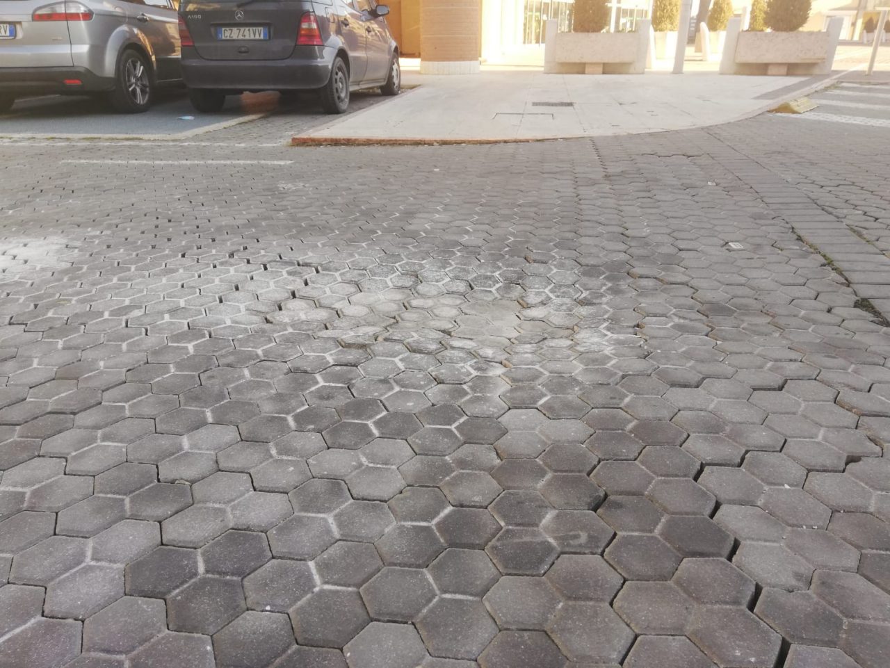 Piazza Villafranchetta “sprofonda”: pavimentazione stradale out. Il sistema a “blocchi”, simili ai sanpietrini, è ormai definitivamente danneggiato.