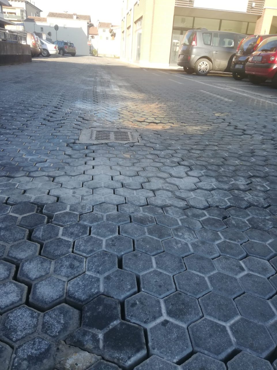 Il via-vai continuo di auto, soprattutto durante il mercoledì di mercato, ha ormai distrutto la pavimentazione che non è stata fatta in asfalto ma a blocchi, a mo’ di sanpietrini, che però non hanno retto il tempo e il calpestio. E quando piove gli avvallamenti, ormai visibili da grande distanza, diventano piccole piscine la cui acqua raggiunge metà ruota.