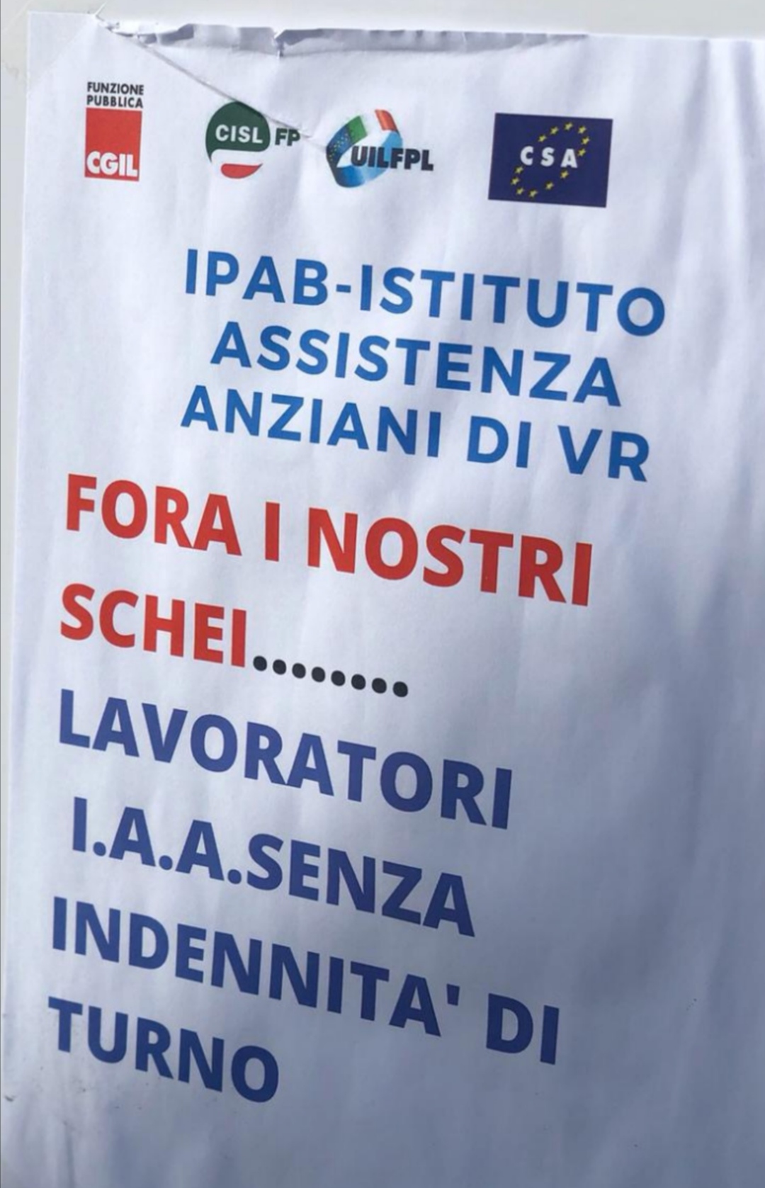 A commentare la  giornata Sonia Todesco Segretaria  Generale della FP CGIL di Verona:  “In tanti anni non avevo mai assistito  ad una tale spregiudicatezza in un  ente pubblico. Invane le decine di  richieste di incontro. Invani gli  appelli a rendere trasparente la  spesa, da parte della direzione, sul  fondo aziendale. Nulla. Una  resistenza assoluta a qualsiasi  trasparenza che impedisce, di fatto, la sottoscrizione del  Contratto aziendale”. La protesta sale e la vertenza, in corso da  mesi, è affrontata da Consiglio di amministrazione e direzione minimizzando e incolpando lavoratori  e sindacati. Intanto continuano i  prelievi coatti sulla busta paga a  ristoro del “presunto” debito dei  lavoratori per le festività  infrasettimanali. Un debito che l’ente  ha ritenuto di non far accertare da un  giudice ma ha scelto di procedere,  senza un titolo giuridico, con prelievi  coatti sulla paga mensile dei lavoratori”.  Aggiunge Sonia Todesco: “Al prelievo  coatto si sommano i mancati  pagamenti delle indennità di turno e  rischio disposte dalla direzione sulla  base di una sua invenzione  interpretativa del Contratto Nazionale, unica in tutta Italia.” “Stiamo  procedendo con vertenze e ricorsi su  tutti i fronti: decreti ingiuntivi contro il prelievo coatto sulla busta paga, ricorso per il  riconoscimento del tempo per il cambio divisa, ricorsi al giudice del lavoro per attività  antisindacale. Abbiamo programmato un incontro alla Corte dei Conti per la verifica del fondo  aziendale costantemente in disavanzo senza che ci  siano state date spiegazioni”. Dal comunicato stampa emerge che “I lavoratori davanti ai  cancelli commentano che di problemi ne hanno  sempre avuti in questi anni ma che con l’arrivo di  questa direzione i ‘metodi’ per risolverli lasciano  intravedere cattiveria ed arroganza. Nel frattempo si sta attendendo la sentenza del giudice del lavoro  di Verona sul comportamento antisindacale  dell’ente e il pronunciamento del giudice sulla  denuncia penale promossa dall’ente nei confronti  di 33 lavoratori per fatti accaduti in giornata di  sciopero. Sul punto si è già pronunciato l’Ordine  degli Infermieri nelle scorse settimane. Ha deciso  di non accogliere la richiesta dell’ente di intervenire disciplinarmente nei confronti degli  infermieri. Tutto archiviato perché non si  ravvisano infrazioni disciplinari”. “La consideriamo  la risposta corretta ad una farsa messa in campo  dalla direzione e dai suoi seguaci finalizzata, senza  successo, a depotenziare il sindacato e intimorire i  lavoratori. Pratiche ottocentesche a cui resisteremo. La vera preoccupazione” , aggiunge  Todesco, “Dovrebbe averla la politica che corre quando ha il compito di nominare i consigli di  amministrazione e selezionare direttori e scappa quando è chiamata a spiegare, a lavoratori e  ospiti, le loro politiche manageriali. E qui da spiegare c’è davvero molto”.