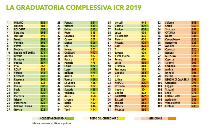 Prima in classifica ancora una volta Milano, seguita da Firenze e in terza posizione Bologna. Diminuisce però la distanza con le prime subito dopo il podio che sono BergamoTorinoTrento e Venezia.