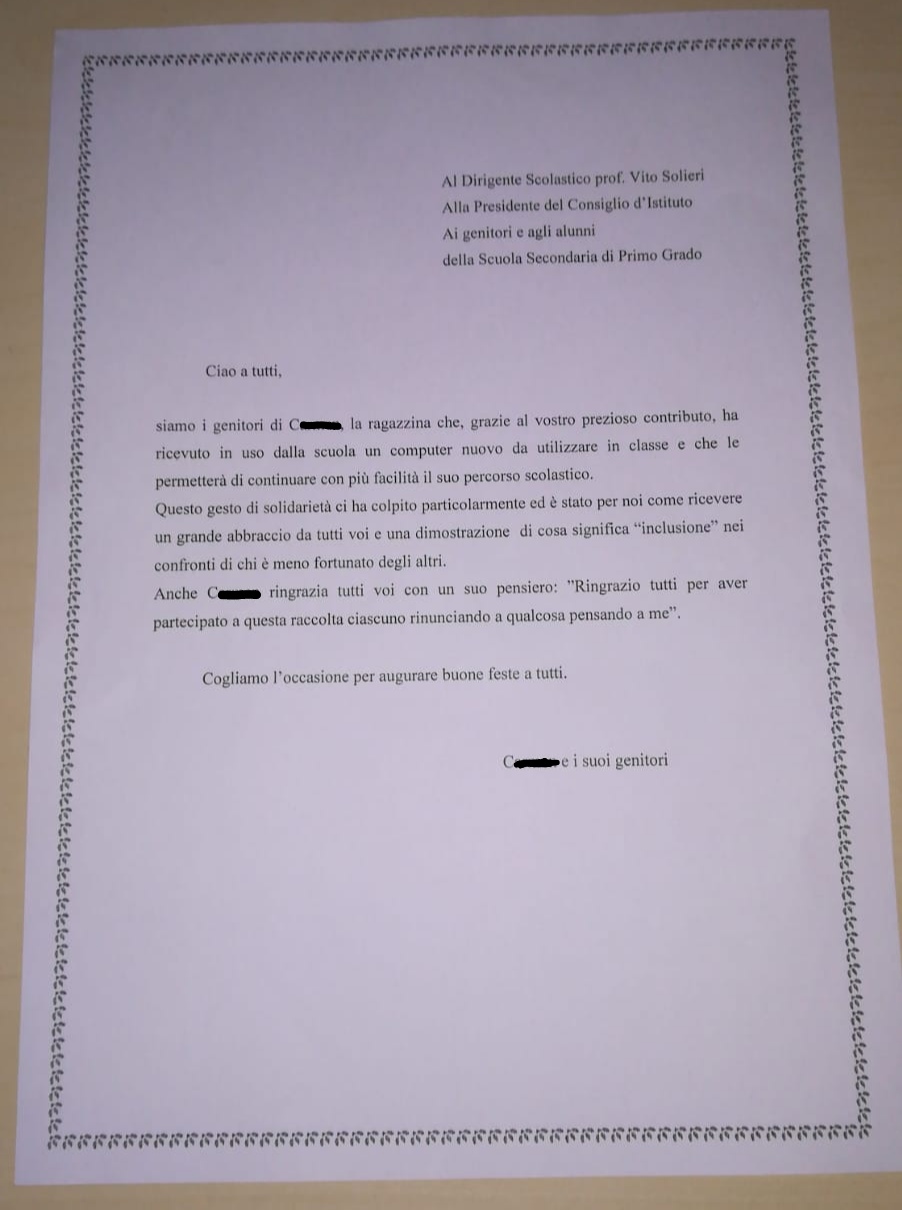 Sonia Granuzzo, in qualità di presidente del Consiglio d’istituto dell’IC Dossobuono, è stata incaricata di contattare le rappresentanti di classe, affinché diffondessero il messaggio a tutte le famiglie, di organizzare la raccolta e, successivamente, con la famiglia, procedere all’acquisto del pc.