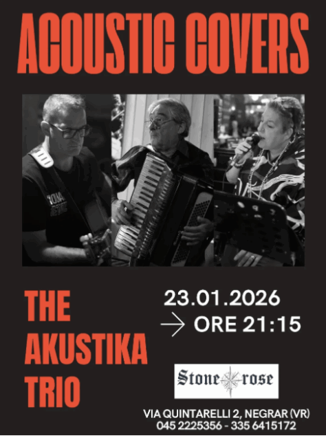 Venerdì 23 gennaio dalle 21:15, allo Stone Rose di Negrar, vi aspetta una serata all’insegna dell’ottima musica con Akustika Trio. Il trio propone canzoni italiane e internazionali in chiave acustica, creando atmosfere intime e coinvolgenti. Per prenotazioni: 045 2225356 oppure 335 6415172.