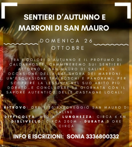 Per chi ama la natura e il foliage autunnale, domenica 26 ottobre torna l’escursione “Camminando verso l’autunno”, in occasione della 54ª Sagra dei Marroni di San Mauro di Saline.