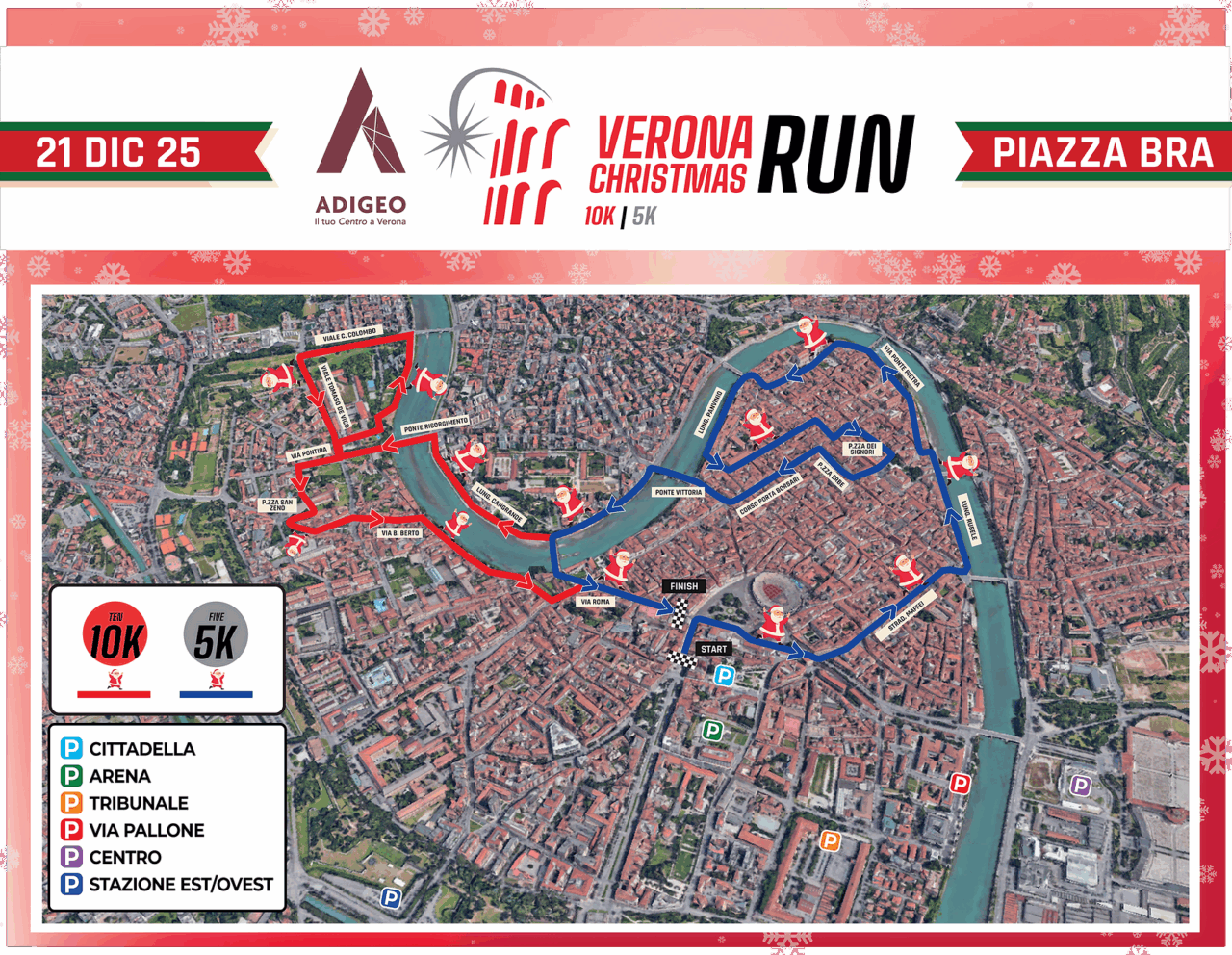 L’Adigeo Christmas Run sta arrivando a Verona, dove si prevede si riuniranno circa 5mila Babbo Natale che potranno scegliere tra la corsa da 5 chilometri o quella da 10.