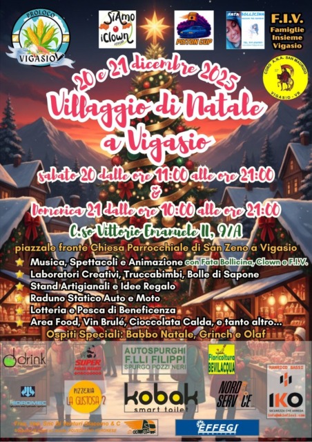 Sabato 20 (dalle 11 alle 21) e domenica 21 dicembre 2025 (dalle 10 alle 21), a Vigasio, in Corso Vittorio Manuele Secondo (davanti alla Chiesa di San Zeno) sarà allestito il Villaggio di Natale.