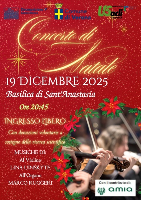 Venerdì 19 dicembre, alle 20.45, si prosegue con il Concerto di Natale nella basilica di Sant’Anastasia con musiche di Lina Uinskyte al violino e Marco Ruggeri all’organo. Ingresso libero con donazioni volontarie a sostegno della ricerca scientifica. Evento con il contributo di Amia e il patrocinio della Circoscrizione 1^-Centro Storico del Comune di Verona.