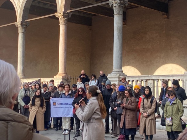 Assessore del Comune di Verona che parla ai manifestanti