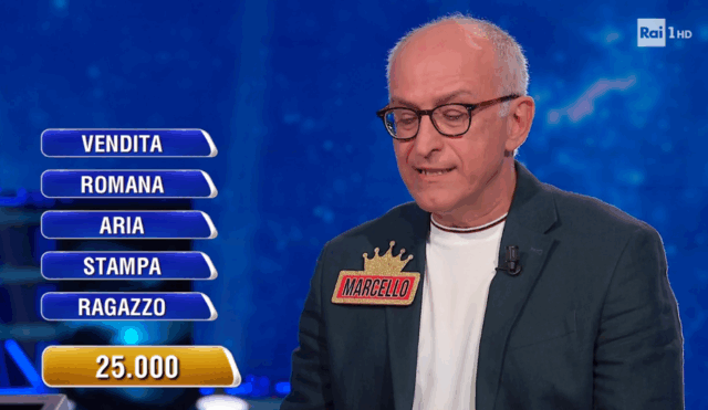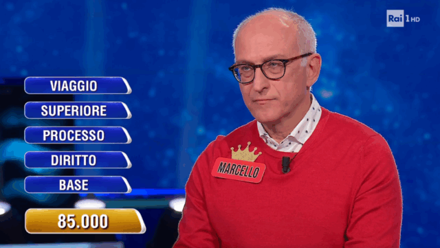 Marcello ha superato facilmente tutti i giochi e, al Triello, si è qualificato insieme a Gianluca ai Cento Secondi, eliminando quest’ultimo. Alla Ghigliottina, con un montepremi iniziale di 170.000 euro sceso poi a 85.000, le parole erano: