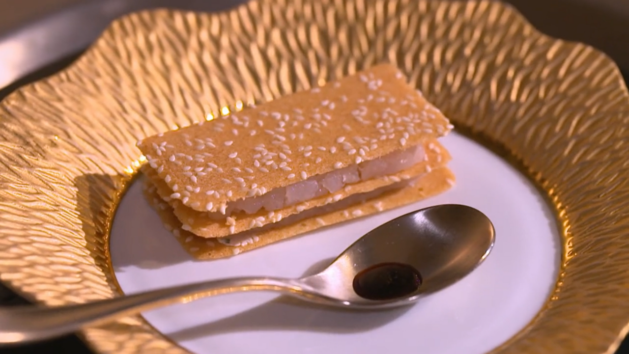 Dounia, vincitrice della prova precedente, si è auto assegnata il wafer al sesamo con tartare di branzino, caprino all’erba cipollina e sensazione di liquirizia, uno dei piatti più riconoscibili dello chef, nato oltre vent’anni fa.